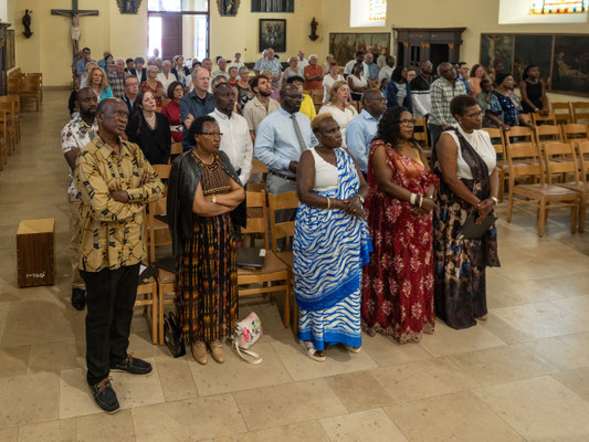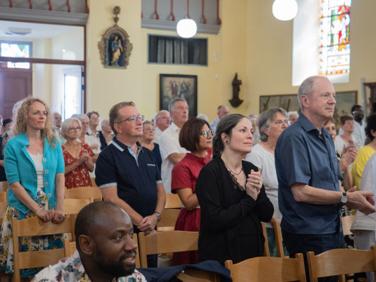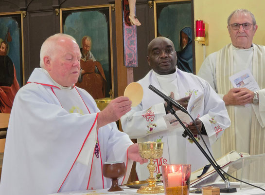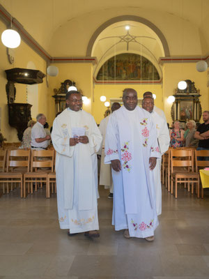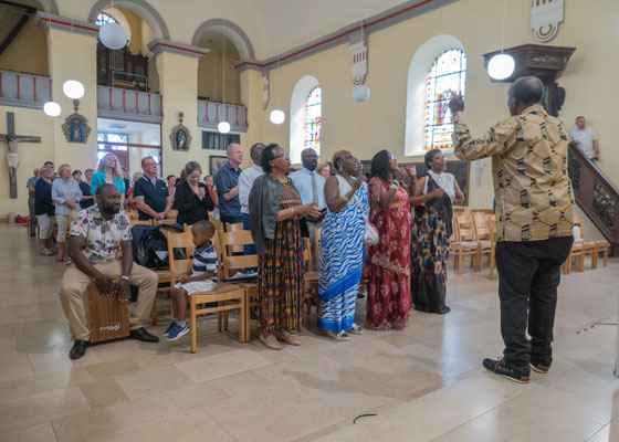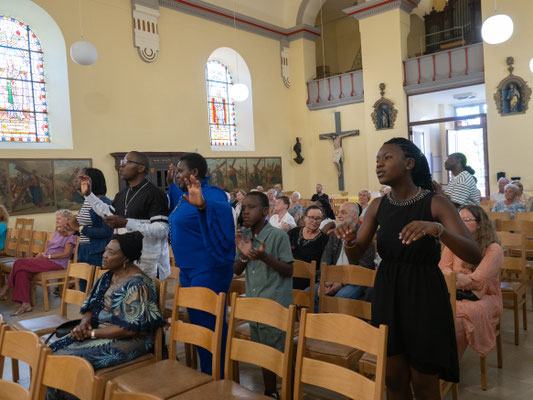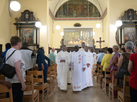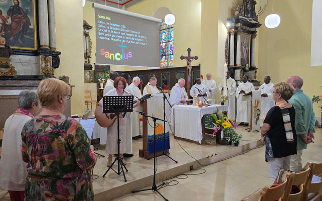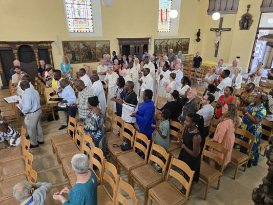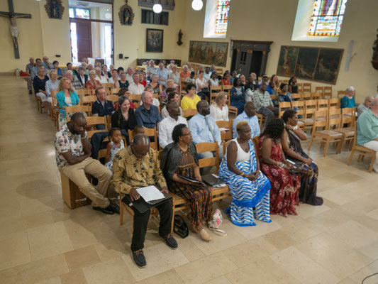Ce dimanche 10 août à 15 heures, une messe d’action de grâce concélébrée par une douzaine de prêtres a réuni de nombreux fidèles issus principalement des paroisses de l’Unité Pastorale Notre Dame des Cuestas. Cette belle cérémonie a été coanimée par la chorale paroissiale de Halanzy sous la direction de Carine DANLOY, organiste titulaire et par une chorale rwandaise qui a remarquablement rythmé l’office par de très vibrants chants dansés.