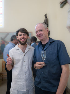 Quelques scupltures de Marc De Winter étaient exposées dans l'église (ici, entre les abbés Patrick et Jean-Marie).